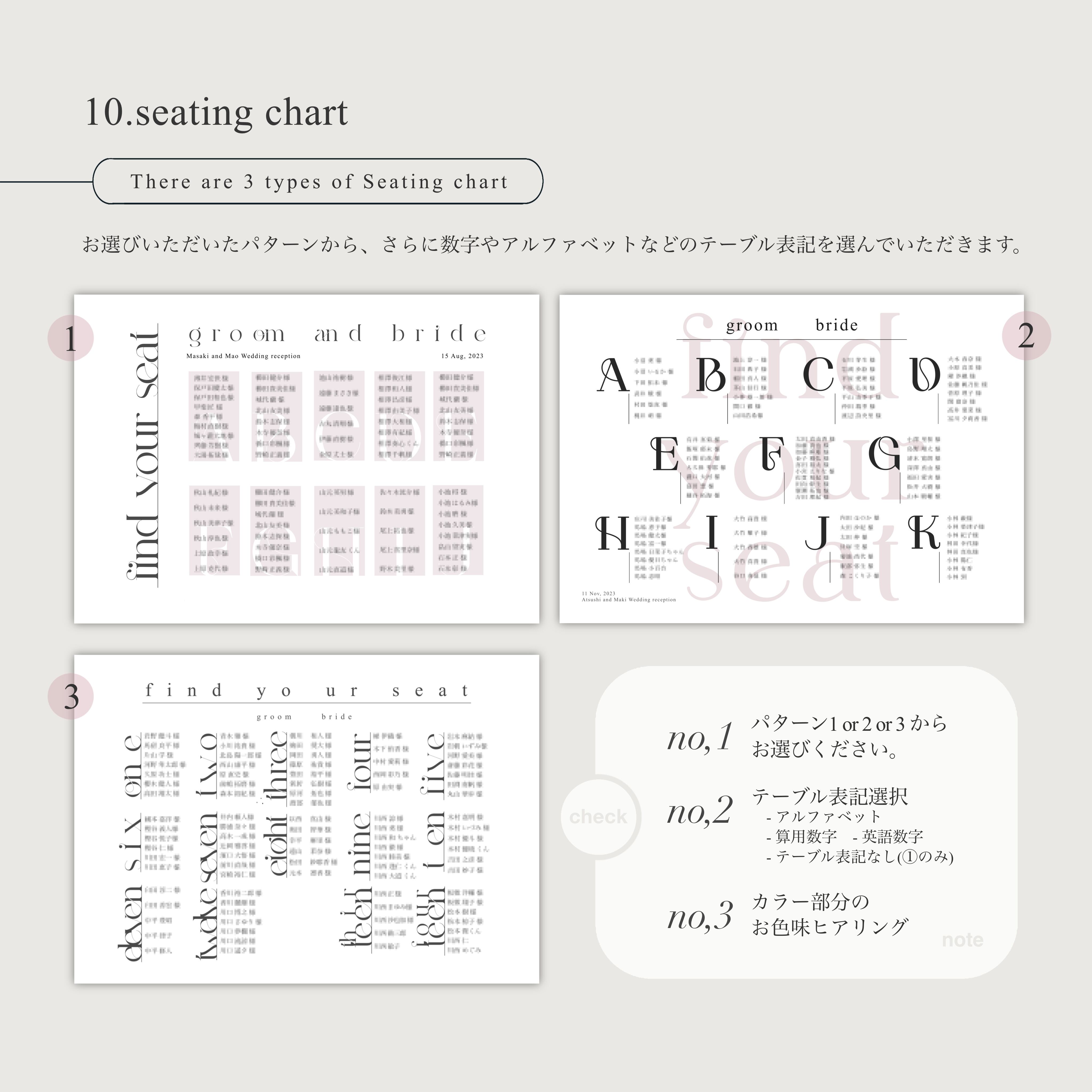 ※seating chart(席次表)はテーブルごとに参列者の方の大まかな紹介を入れることは可能です。基本的にはお一人お一人の肩書を入れることはできません。