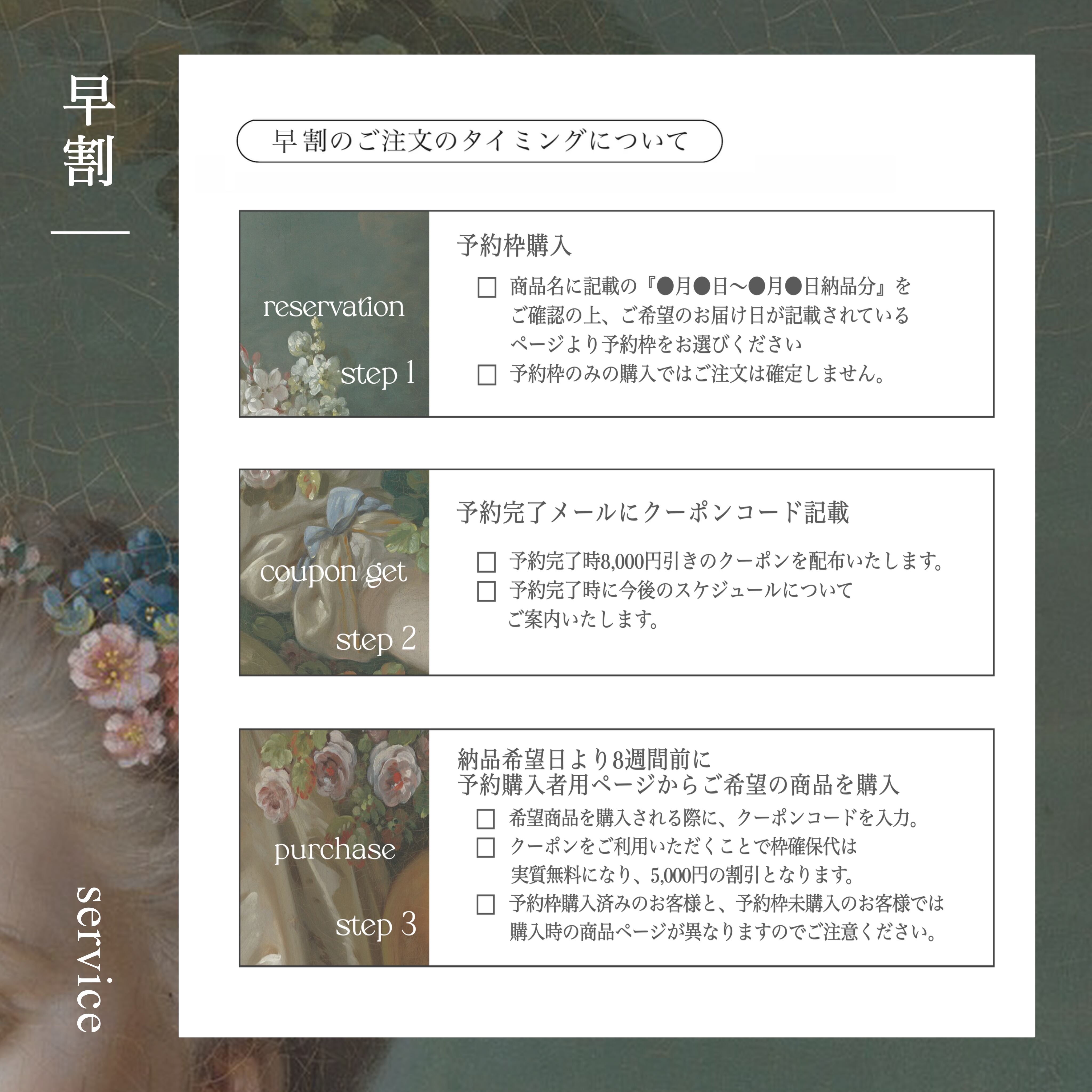 予約枠購入後、お届け希望日の8週間前に商品をご購入いただくことでご利用可能です。