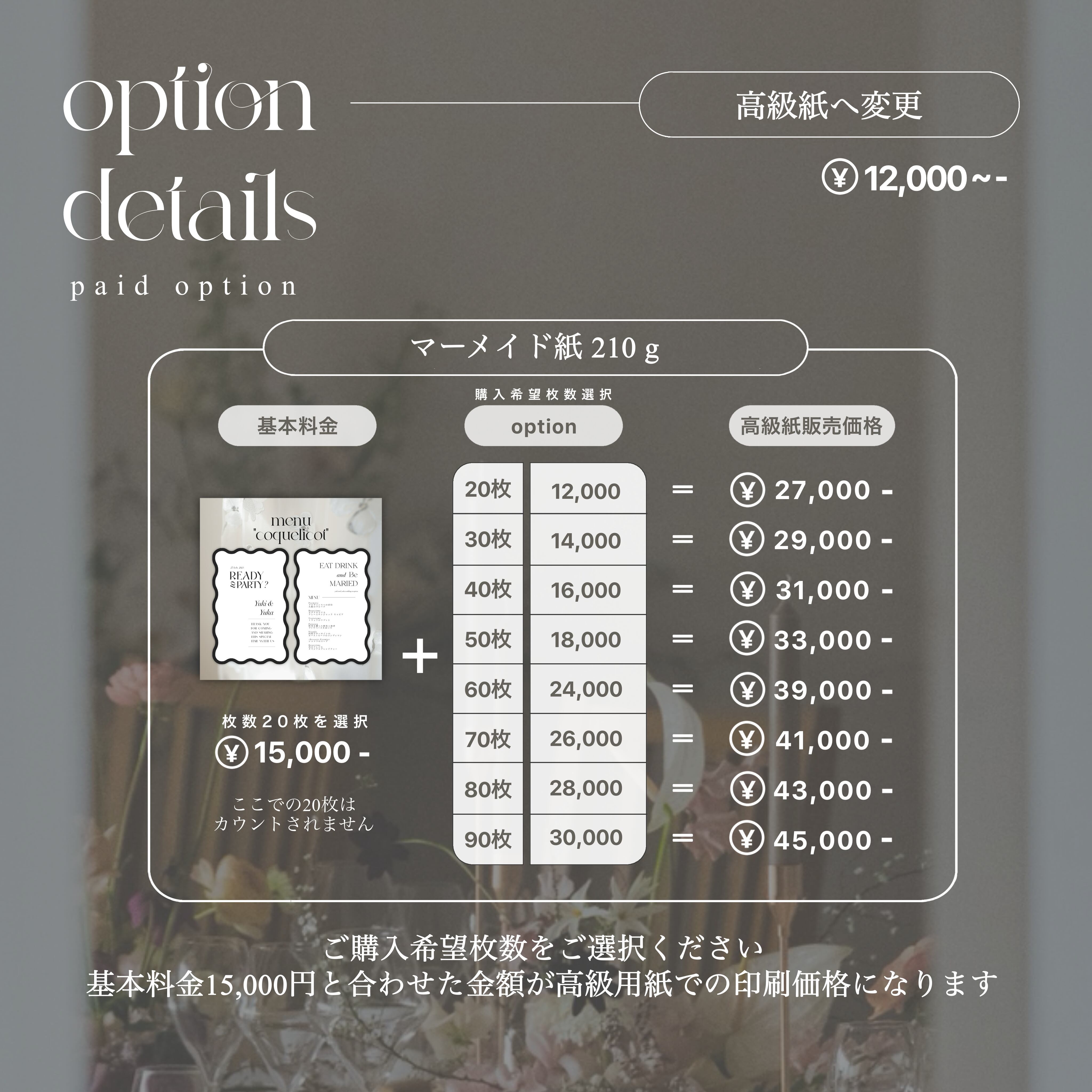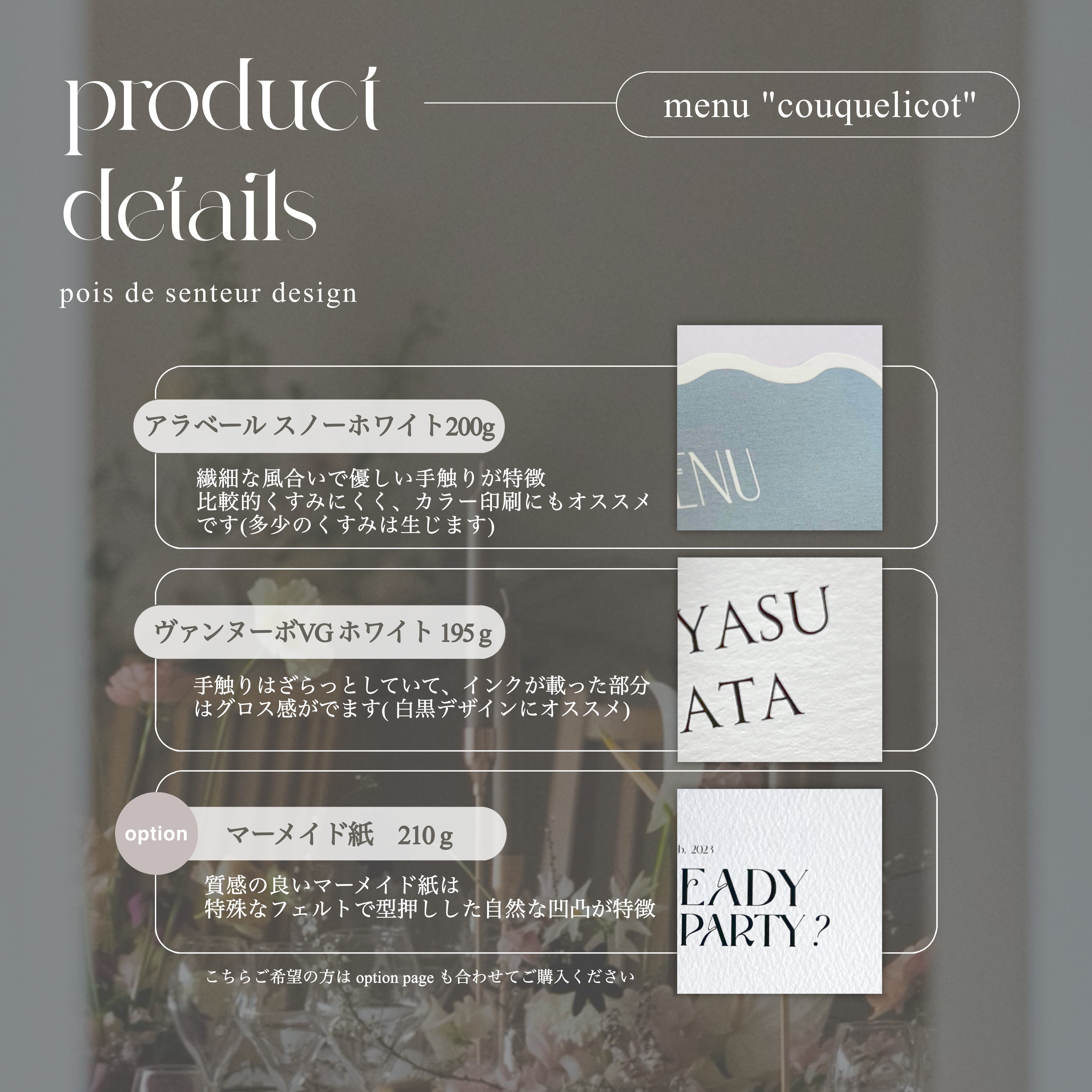 【購入後追加オプション】 menu coquelicot (裏表印刷) をご購入いただいた お客様専用の有料オプションになります 紙材をより高級感のあるマーメイド紙に変更いたします マーメイド紙は特殊なフェルトで型押しした自然な凹凸が特徴 穏やかな波のような風合いから「マーメイド」と名づけられています 特別な1枚でゲストの方に最上級のおもてなしを…